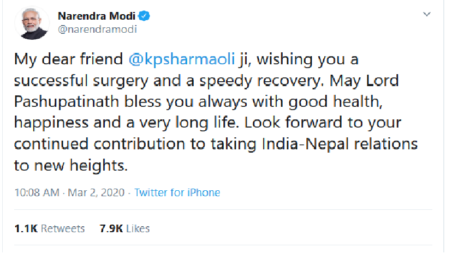 काठमाडौँ– प्रधानमन्त्री केपी शर्मा ओलीलाई भारतीय समकक्षी नरेन्द्र मोदीले सफल शल्यक्रिया र स्वास्थ्य लाभको कामना गरेका छन् । सोमबार बिहान भारतीय प्रधानमन्त्री मोदीले ट्वीटरमार्फत शुभकामना दिएका हुन् ।