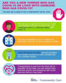 सिटिले क्वारेन्टाइन बस्न छुट्टै कोठा नभएकाहरुका लागि निश्चित अवधिका लागि बस्न मिल्ने ११ हजार वटा निशुल्क होटेलको व्यवस्था गरेको छ । न्युयोर्कमा क्रियाशील विभिन्न समुदायको सस्थाहरुले गरेको विशेष अनुरोधमा मेयर कार्यालयले यो सुविधा दिएको हो ।