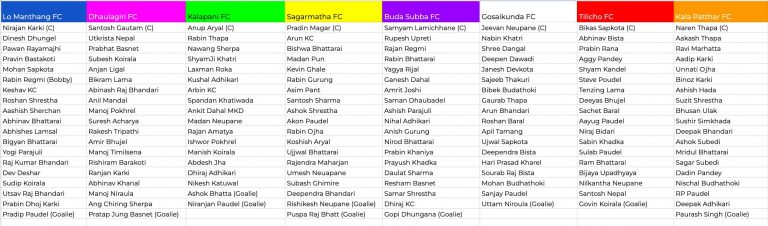 यस पटकको प्रतियोगितामा निरजन कार्की क्याप्टेन रहेको लोमान्थाङ एफसि,सन्तोष गौतम क्याप्टेन रहेको धवलागिरि एफसि, अनुप अर्याल क्याप्टेन रहेको कालापानी एफसि, प्रदिन मगर क्याप्टेन रहेको सगरमाथा एफसि, संयम लामीछाने क्याप्टेन रहेको बुढा सुब्बा एफसि, जीवन न्यौपाने क्याप्टेन रहेको गोसाइकुण्ड एफसि, विकास सापकोटा क्याप्टेन रहेको तिलिचो एफसि र नरेन थापा क्याप्टेन रहेको कालापत्थर एफसि टिमको वीच प्रतिष्पर्धा हुने भएको छ । एपेक्सको प्लेजेन्ट पार्कमा सेप्टेम्बर १३ देखि हुने प्रतियोगिता अक्टुबरको ५ तारिख फाइनल हुने भएको छ ।