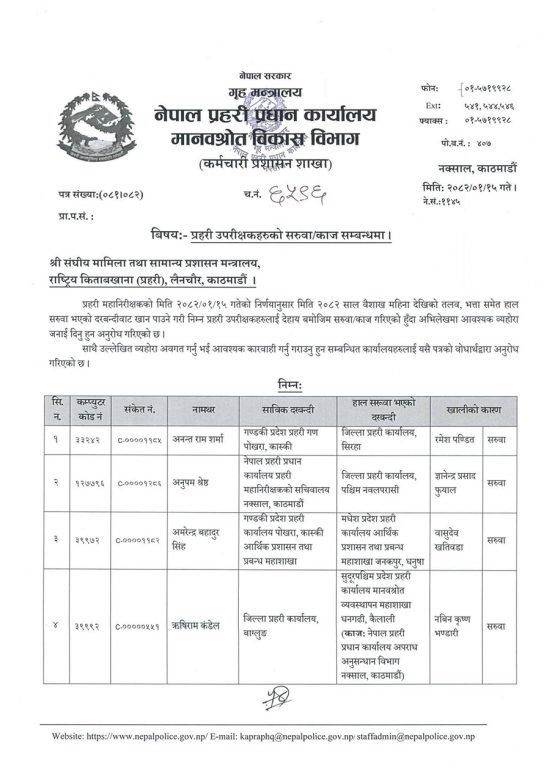 4 Shares -A A +A प्रहरी प्रधान कार्यालयले ६३ जना प्रहरी उपरीक्षक (एसपी) को सरुवा गरेको छ । कार्यालयले सोमबार एक सूचना जारी गर्दै ६३ एसपीहरुको सरुवा गरेको जानकारी दिएको हो ।सरुवा सूची निम्न अनुसार रहेका छन्: प्रकाशित मिति : १५ बैशाख २०८२, सोमबार ६ : १५ बजे