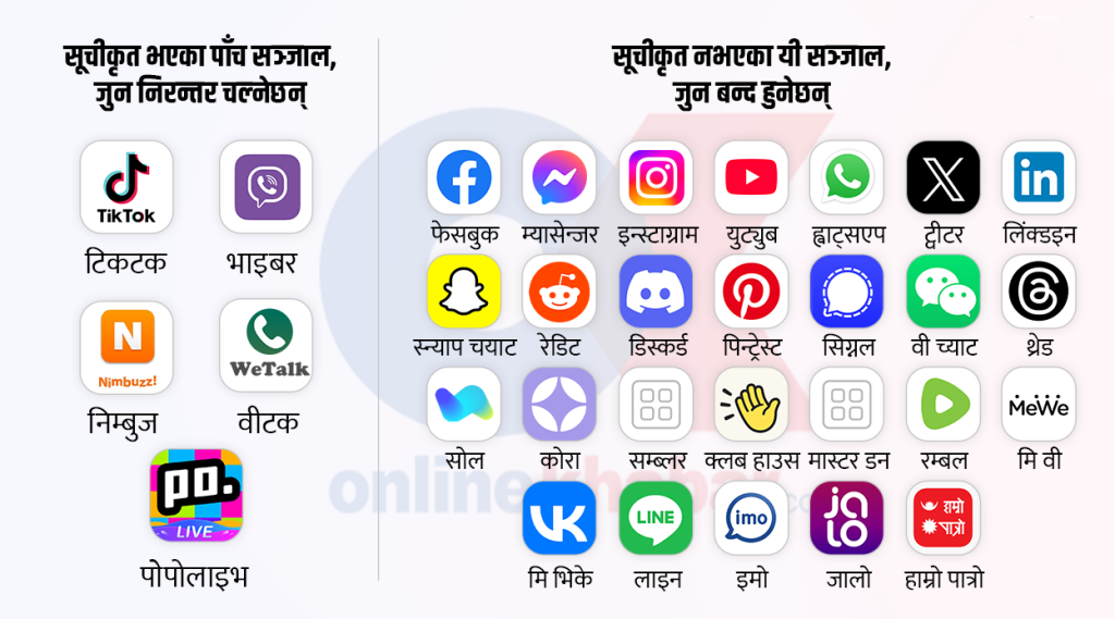 नेपाल दूरसञ्चार प्राधिकरणले बन्द हुने सामाजिक सञ्जालको सूचीसमेत मोबाइल र इन्टरनेट सेवा प्रदायकलाई पठाइसकेको छ । बन्द हुने सूचीमा फेसबुक, मेसेन्जर, इन्स्टाग्राम, युट्युब, ह्वाट्सएप, ट्विटर, लिंक्डइन, स्न्यापच्याट, रेडिट, डिस्कर्ड, पिनइन्ट्रेस्ट, सिग्नल, थ्रेड्स, विच्याट, कोरा, टम्ब्लर, क्लबहाउस, मास्टडोन, रम्बल, मिवी, भिके, लाइन, इमो, जालो, हाम्रो पात्रो र सोल रहेका छन् ।